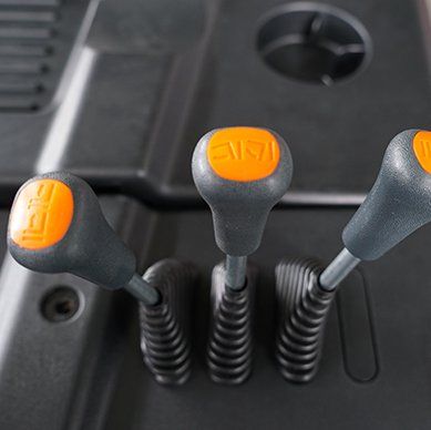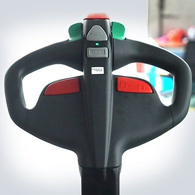 Ergonomic control handle equipped with dual butterfly-style thumb controls, horn button and belly button. Crawl speed button provides safe operation in tight spaces.