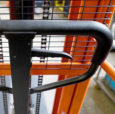 This ergonomic stacker is also equipped with an operator protection screen, wheel lock, dual-push handles mounted to the mast at a comfortable height, and a spring-loaded steering handle with comfort grip. Excellent value!