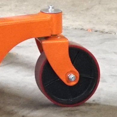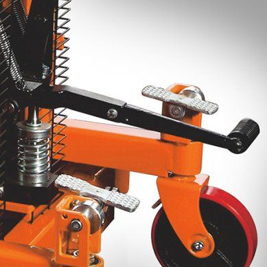 Loads can be lifted by the handle or by a fold-away hydraulic foot pedal. Forks and straddle legs can adjust from side to side to accommodate different skid widths.