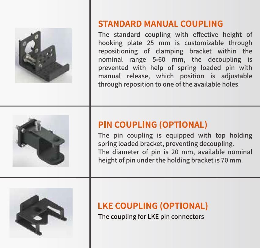 - Standard coupling arm fixed to the tractor, allowing for different coupling heights